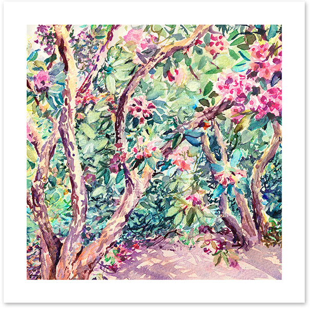 Inspired by the Rhododendron blossoms at Isabella Plantation in Richmond Park, this is part of a series of watercolour studies portraying the kaleidoscope of colour that floods the Royal Park in early spring.