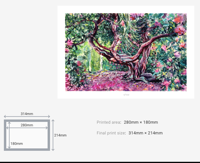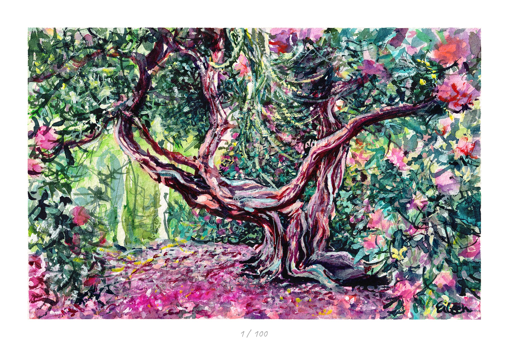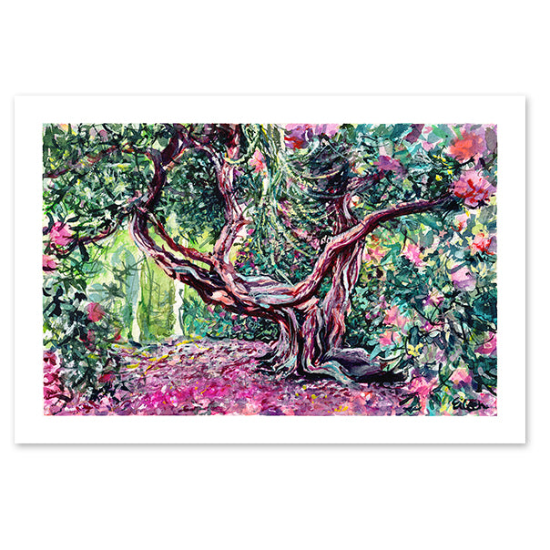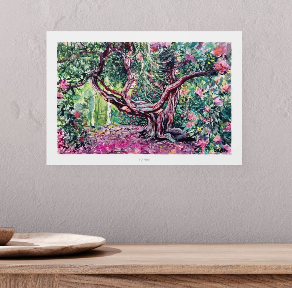 The original watercolour painting was inspired by the Rhododendron Dell at Kew Gardens in London, and it is part of a series titled "Off the Path". The collection captures the rich depth of these spring blossoms in the secluded and oneiric atmosphere that surrounds each tree.