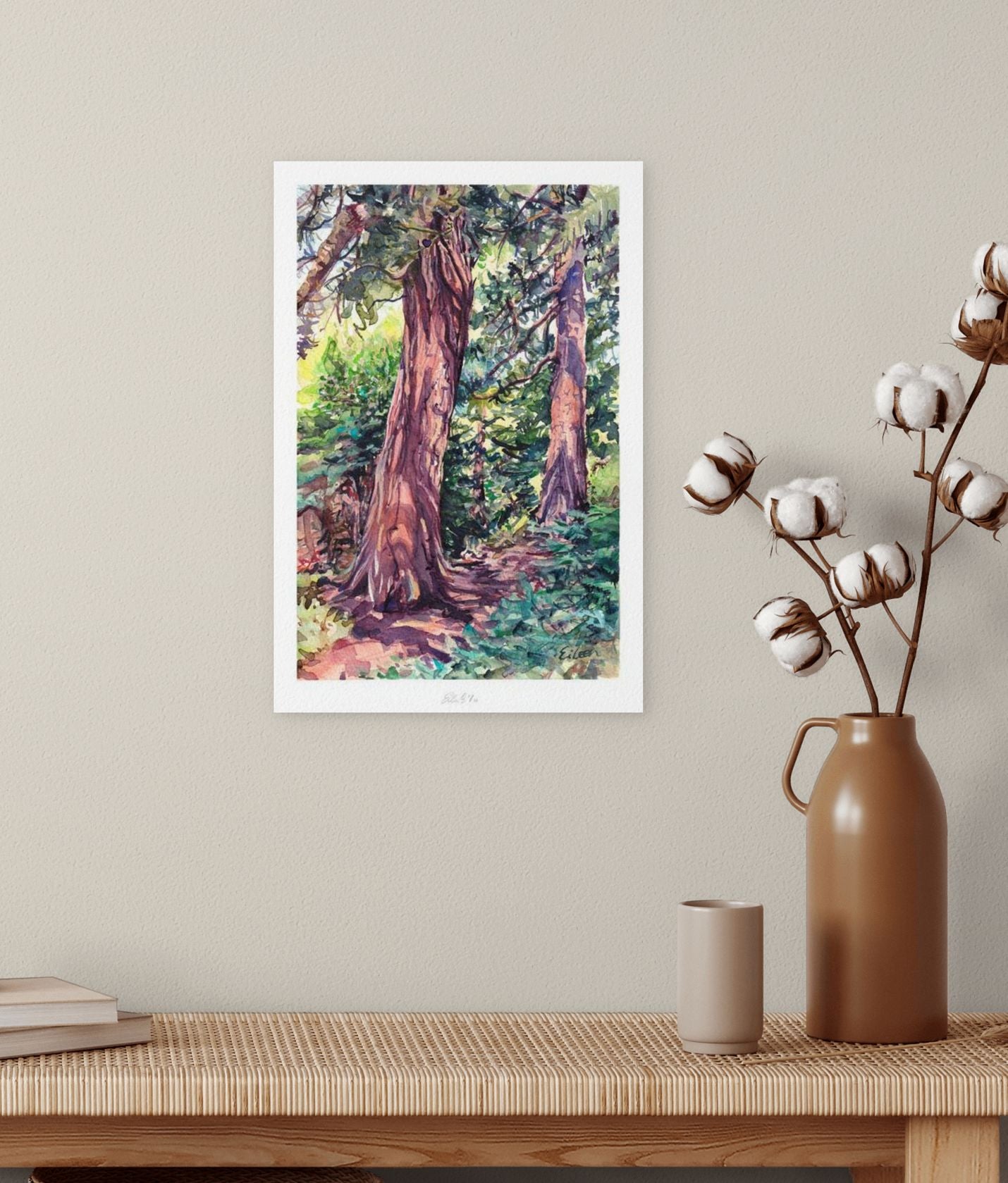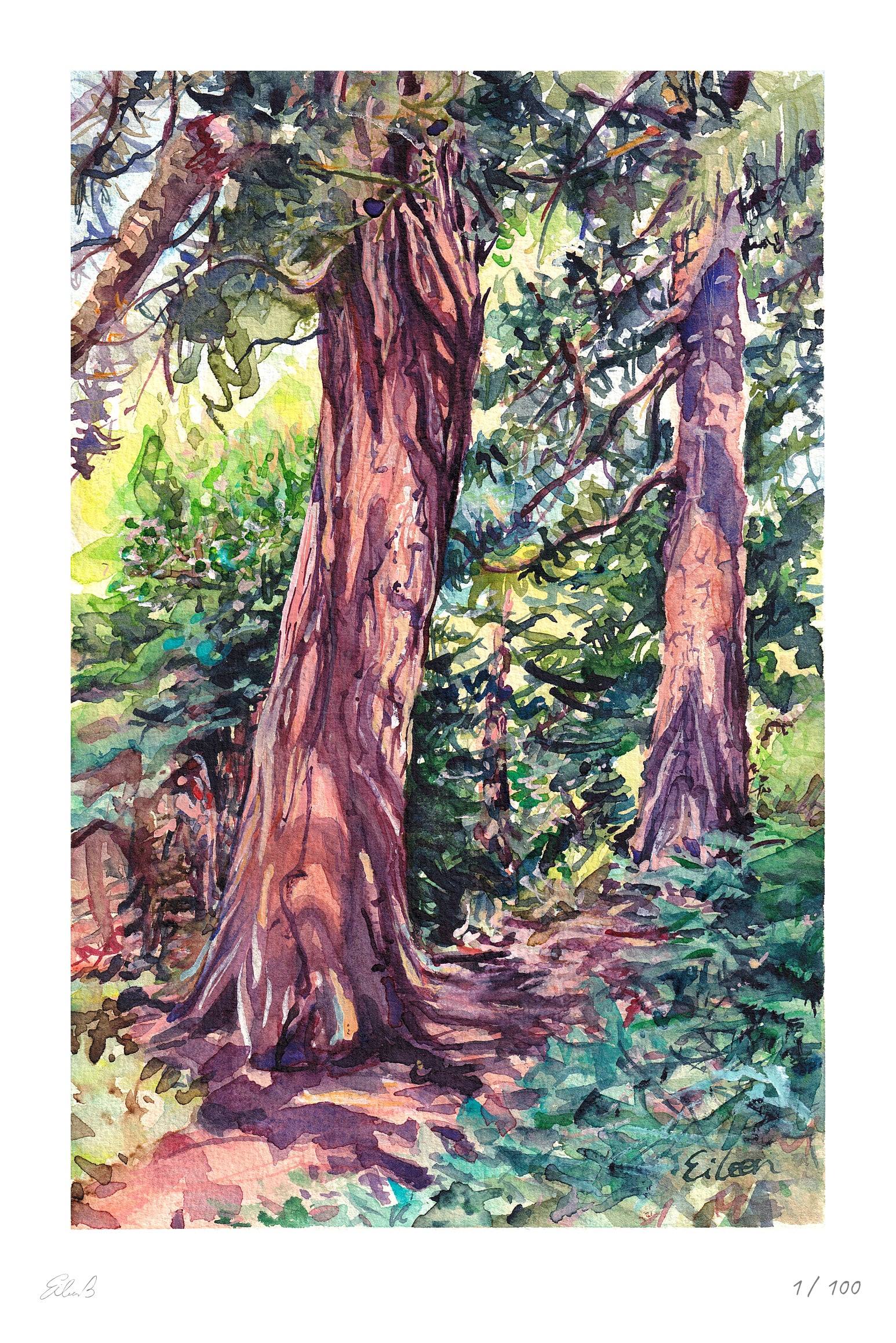 Limited edition from the original hand-painted Watercolour by Eileen Barlow portraying Coastal Redwoods from Kew Gardens.