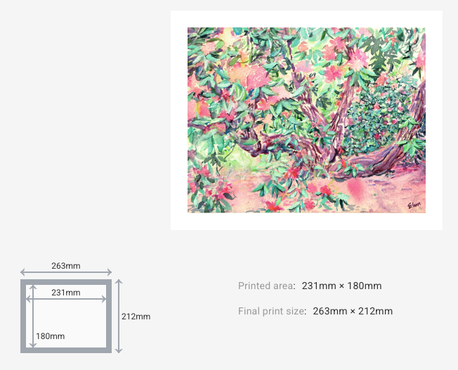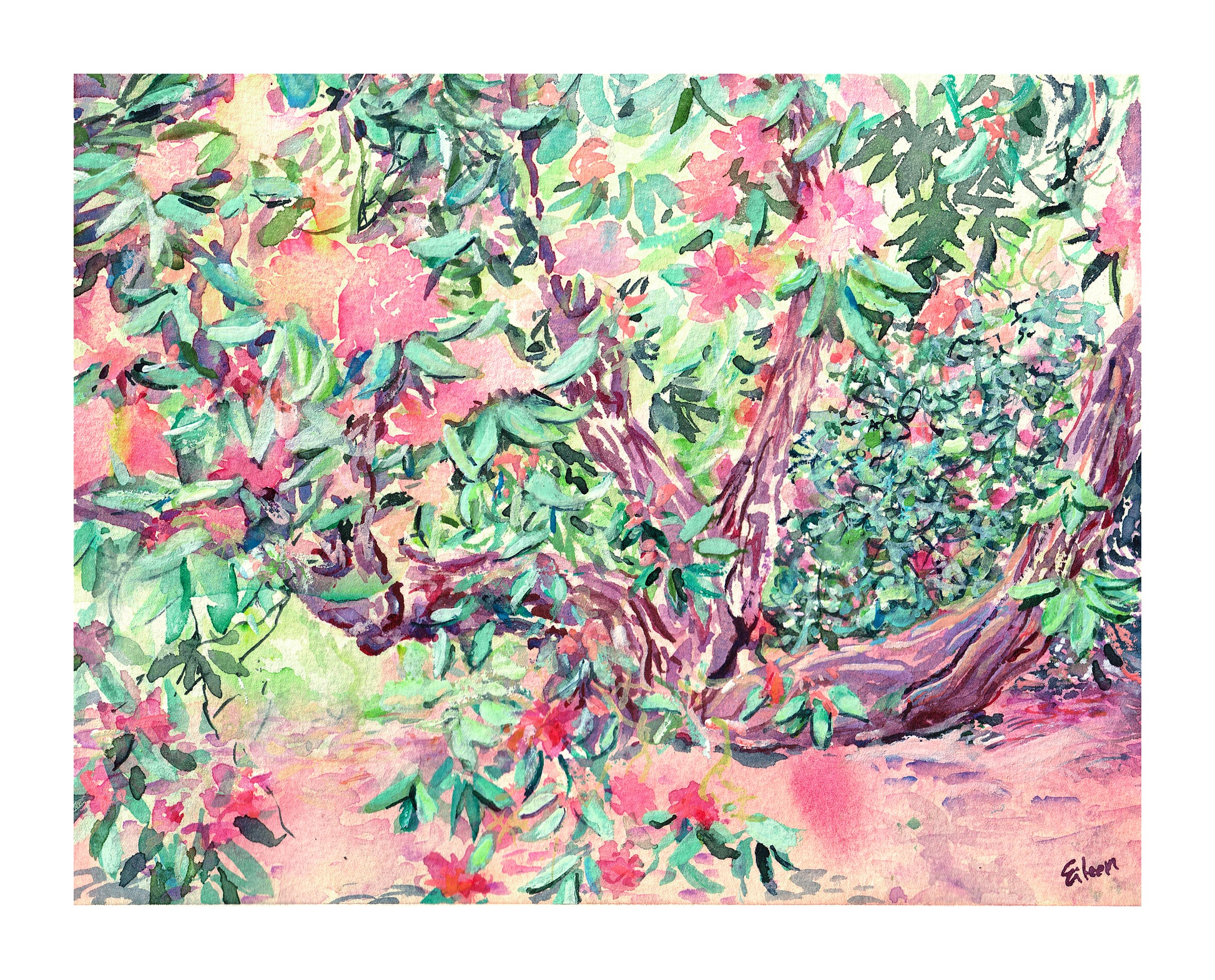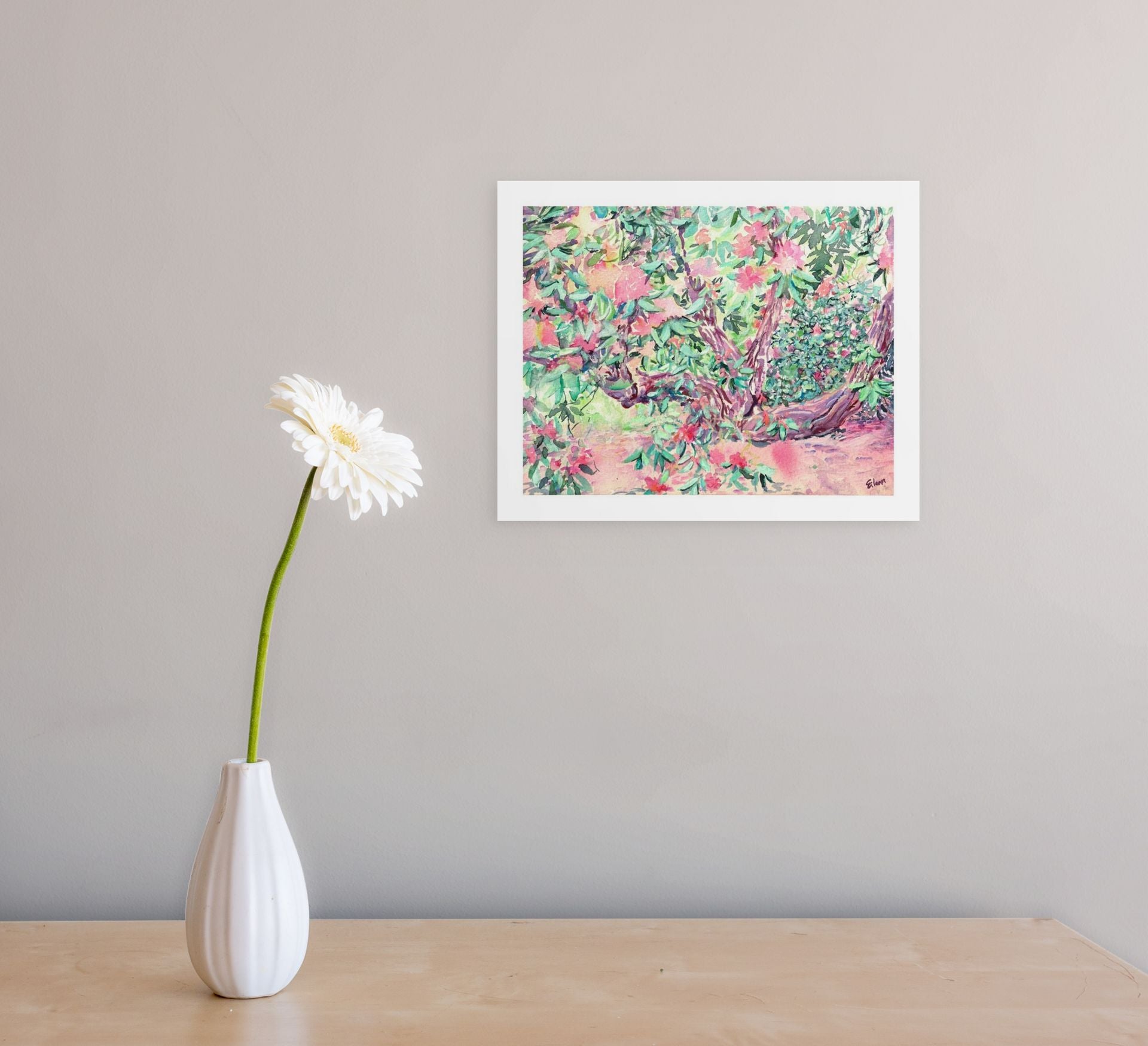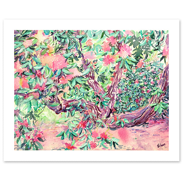 Soft and delicate washes of warm pink and turquoise create luminous depth behind this expressive pink Rhododendron tree. The original art was inspired by the Rhododendron Dell at Kew Gardens, London, and it is part of a series of hand-painted watercolour paintings titled "Off the Path" which captures the richness of these spring blossoms in the secluded and oneiric atmosphere that surrounds each tree.