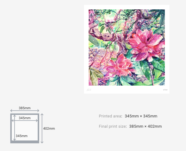 This limited edition is signed and numbered, and the two sizes available have print artwork dimensions that fit standard frame sizes: square 20cm x 20cm and 30cm x 30cm (without white border).