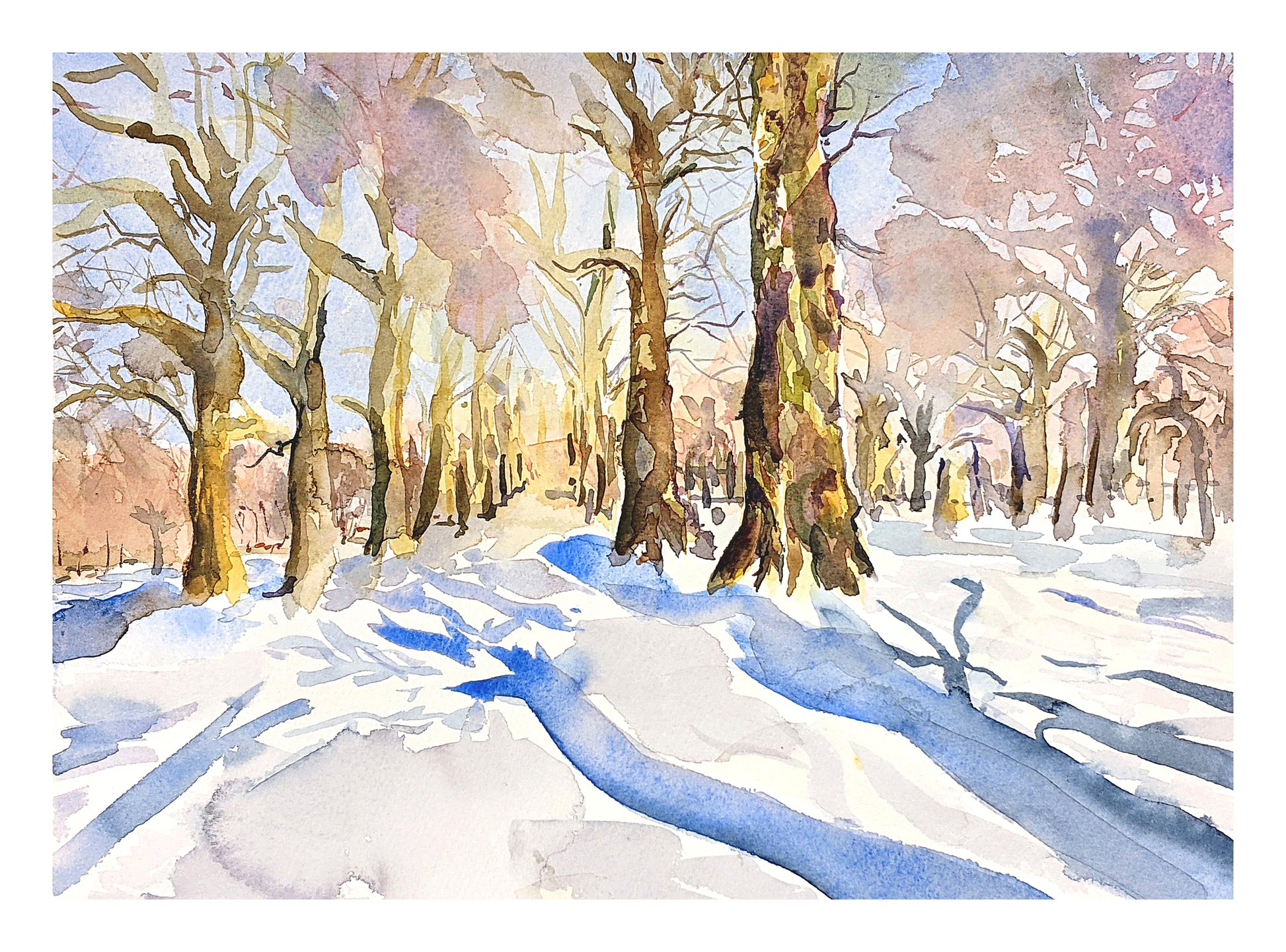 This limited edition is a reproduction from an original watercolor (2022), capturing the dramatic contrast of warm light and cool shadows moving across the frozen woodland with graded washes and expressive brush work.